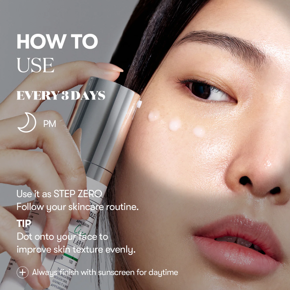 Este tratamiento no es de uso diario debido a su alta potencia; se recomienda aplicarlo cada tres días. Su textura tipo gel puede generar un leve hormigueo al contacto, lo cual es normal y refleja la acción de las microespículas. Es ideal para pieles con textura irregular, poros dilatados, manchas leves o falta de luminosidad. No debe usarse sobre piel irritada, inflamada ni junto con dispositivos de estimulación.